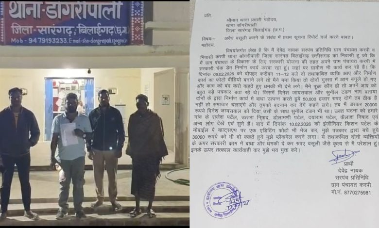 सारंगढ़/डोंगरीपाली: छत्तीसगढ़ के सारंगढ़-बिलाईगढ़ जिले में पत्रकारिता के नाम पर अवैध वसूली और ब्लैकमेलिंग का एक शर्मनाक मामला उजागर हुआ है। ग्राम पंचायत करपी में सरकारी काम रुकवाने और बदनाम करने की धमकी देकर दो तथाकथित पत्रकारों द्वारा सरपंच प्रतिनिधि को मानसिक और आर्थिक रूप से प्रताड़ित करने का आरोप लगा है। पीड़ित ने अब डोंगरीपाली थाने में नामजद शिकायत दर्ज कराकर सुरक्षा और कार्रवाई की गुहार लगाई है।