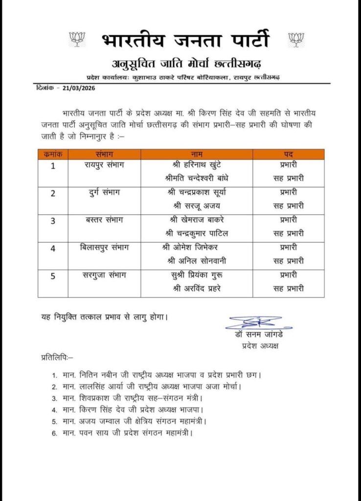 प्रदेश अजा मोर्चा अध्यक्ष डॉ. सनम जांगड़े के निर्देशानुसार जारी सूची में संगठन के विस्तार और जमीनी स्तर पर सक्रियता बढ़ाने पर विशेष जोर दिया गया है। मोर्चा का उद्देश्य पार्टी की विचारधारा को गांव-गांव तक पहुंचाना और कार्यकर्ताओं को अधिक सक्रिय करना है।